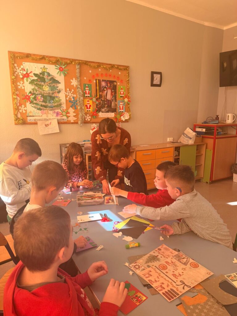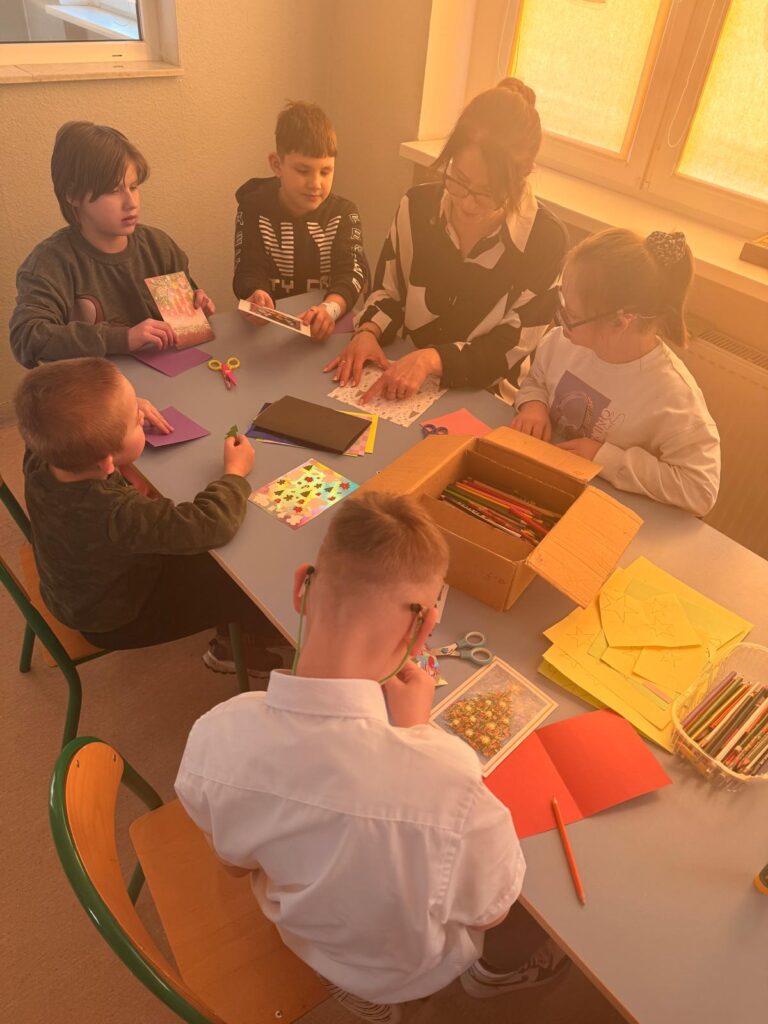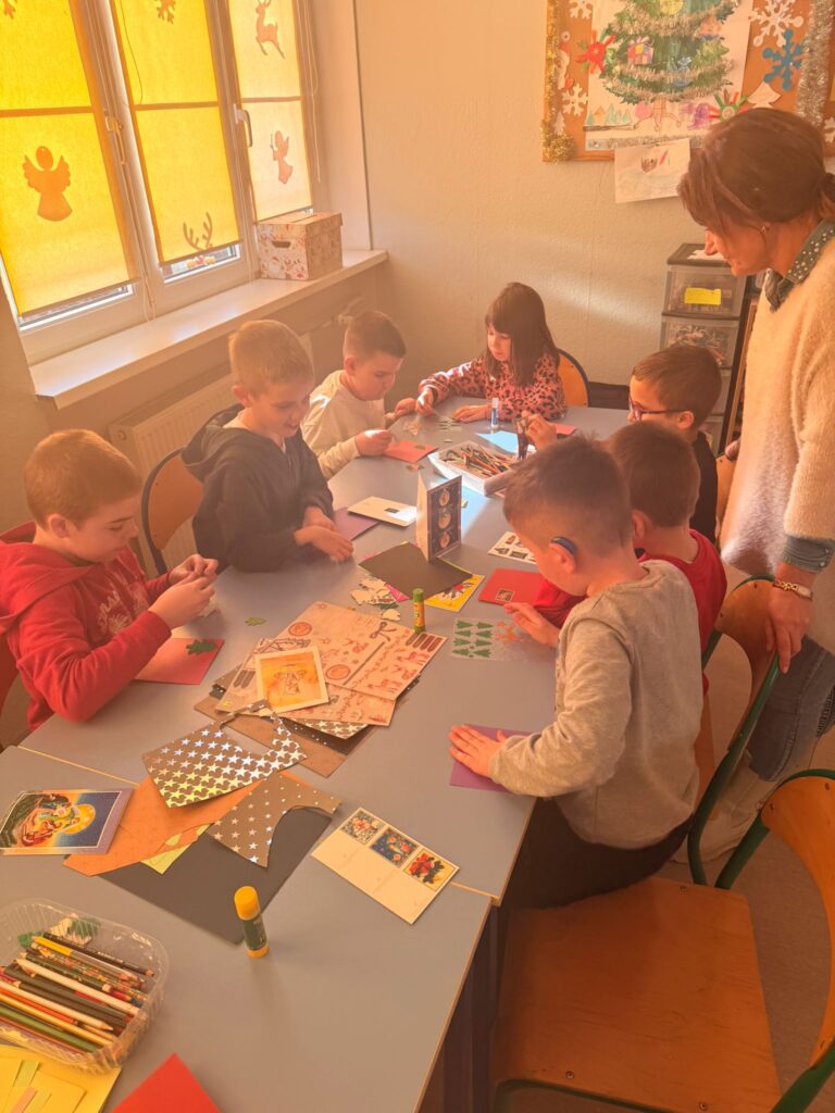 Kolejnym wydarzeniem było własnoręczne wykonywanie kartek świątecznych dla najbliższych. Uczniowie z dużym zaangażowaniem przygotowywali kartki, wkładając w nie wiele serca . Zajęcia te były okazją do rozmów o tradycjach bożonarodzeniowych oraz o znaczeniu okazywania uczuć i pamięci o bliskich.