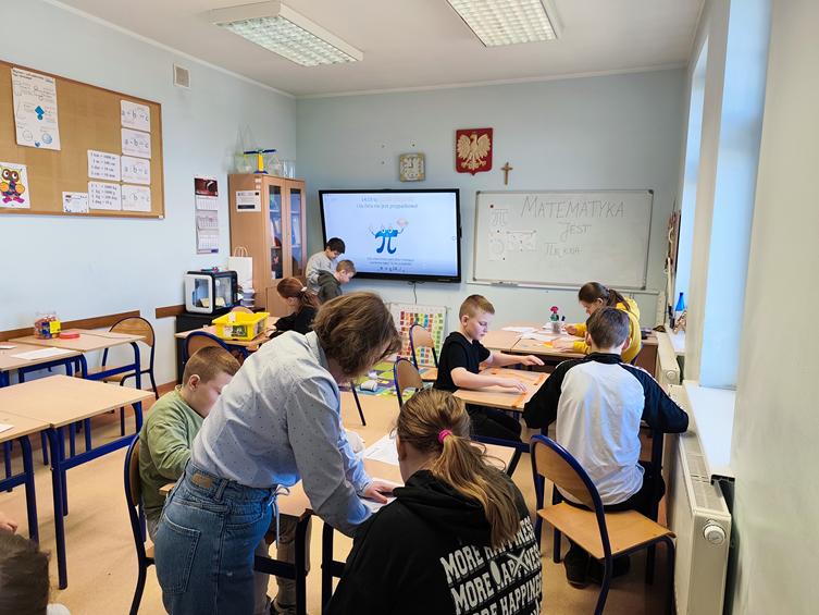 13 marca w naszej szkole świętowaliśmy Dzień Matematyki (12 marca) oraz Dzień Liczby Pi (14 marca). Z tej okazji uczniowie klas 4–8 wzięli udział w matematycznej grze zadaniowej. Na uczestników czekało 10 stacji z różnorodnymi zadaniami. Za poprawne rozwiązanie zadania uczniowie zdobywali literki potrzebne do odgadnięcia hasła. Wśród wyzwań znalazły się m.in.: budowanie liczby π z klocków LEGO, programowanie trasy robota Photon przez
