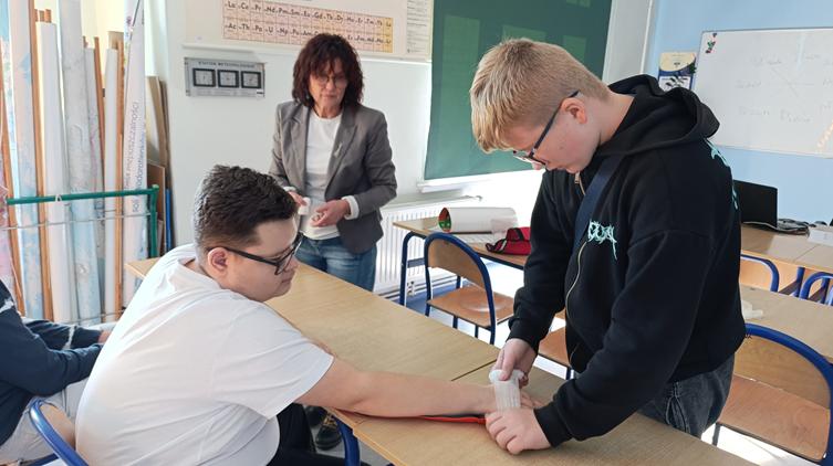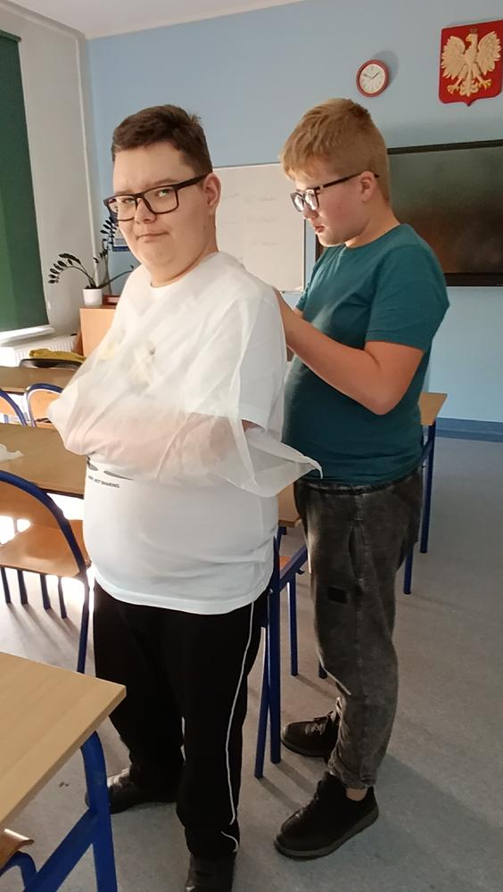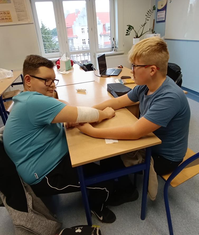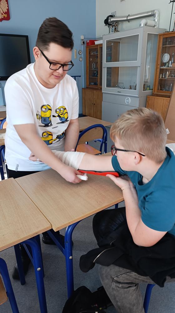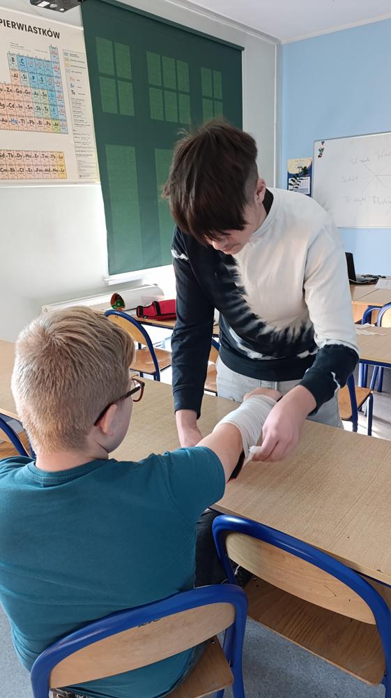 Uczniowie klasy 7 szkoły podstawowej uczestniczyli w zajęciach z biologii poświęconych nauce udzielania pierwszej pomocy. Celem lekcji było zapoznanie uczniów z podstawowymi umiejętnościami tamowania krwotoków, opatrywania ran oraz udzielania pomocy przy złamaniach i zwichnięciach.                               Zajęcia odbywały się pod czujnym okiem pani pielęgniarki.